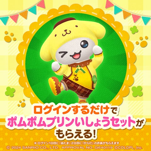 ログインボーナスでは「ポムポムプリンの帽子」「ポムポムプリンのお洋服」がもらえます。