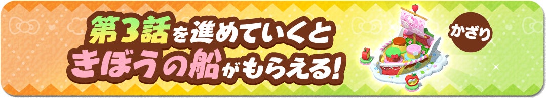 ハローキティたちがふるさとへ帰る手助けをするために、「第3話」のミッションをクリアして、「ふるさとつなぐきぼうの船」を手に入れましょう。