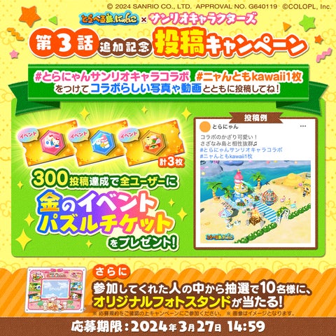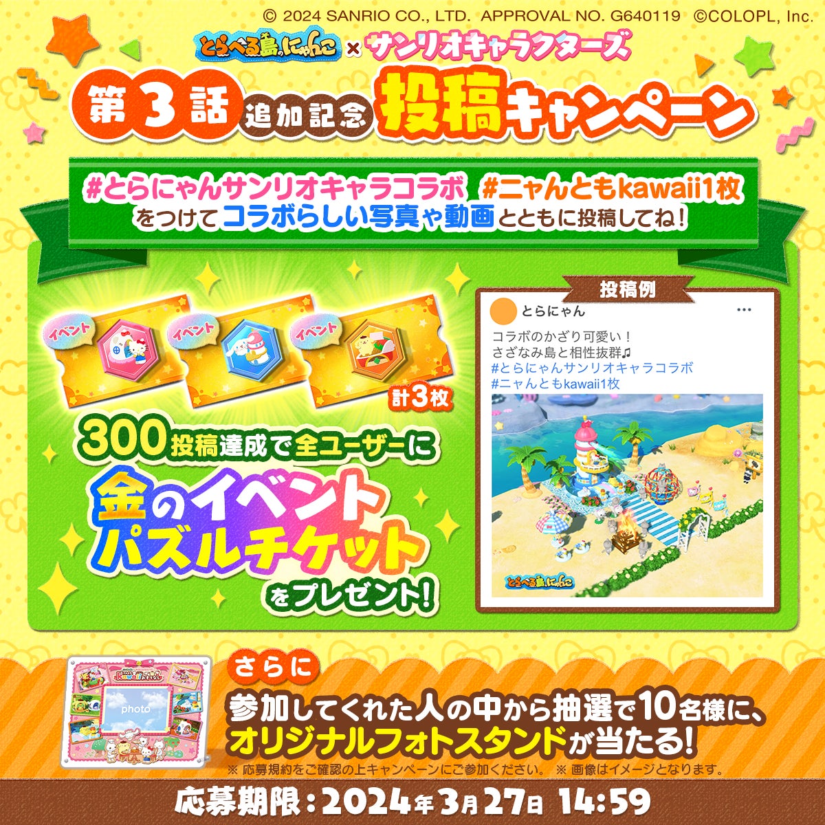 本日3月20日(水)から、「とらべる島のにゃんこ×サンリオキャラクターズコラボ ニャんともkawaiiおもてなし」イベントの新ミッション「第3話」がスタートしました。