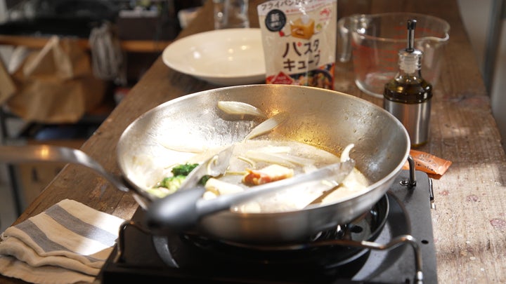 CMでは、「パスタキューブ™」を使った具だくさんペペロンチーノ作りが楽しまれています。