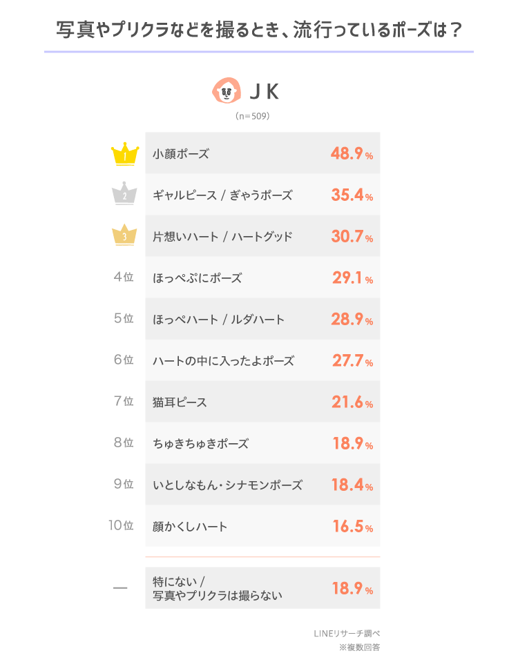 - 女子高生の1位ポーズは「小顔ポーズ」で、写真やプリクラで流行っている