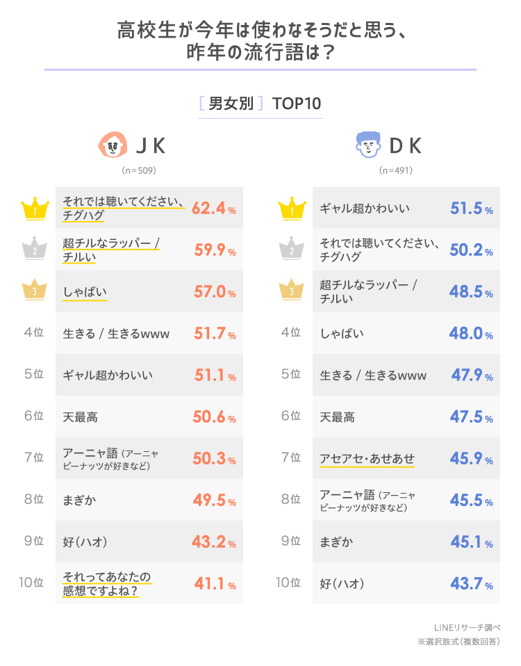 「それでは聴いてください、チグハグ」「超チルなラッパー/チルい」「それってあなたの感想ですよね?」は、男子高生よりも女子高生で高い割合でした。また、昨年の流行語ランキングで女子高生の4位・5位だった「天最高」「生きる/生きるwww」もランクインしました。