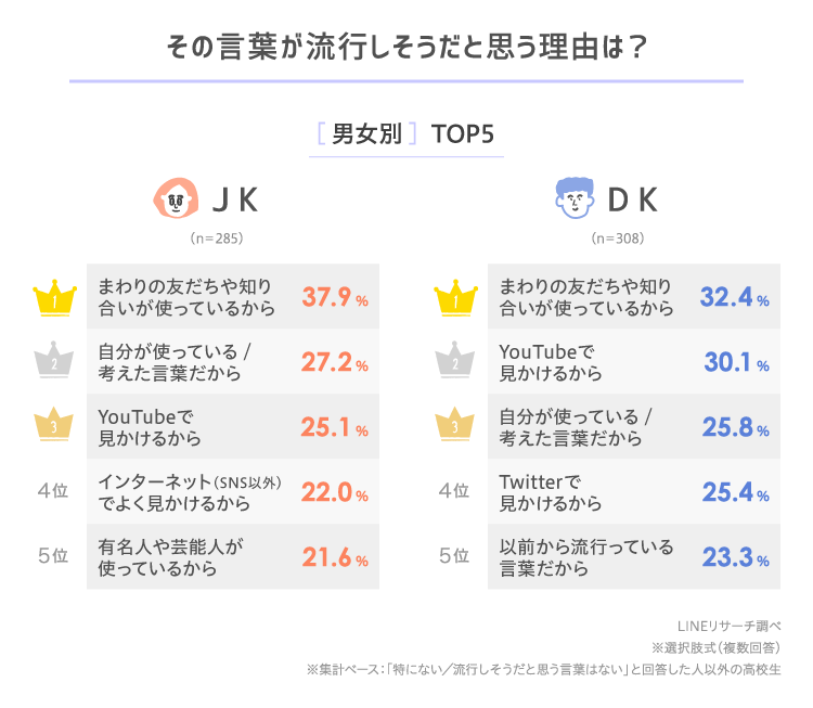 2位以降は、男女で違いがみられました。男子高生では、2位に「YouTubeで見かけるから」が3割超で入りました。次いで3位の「自分が使っている/考えた言葉だから」、4位の「Twitterで見かけるから」が僅差で続きました。