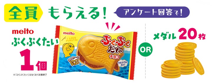 友だち追加&アンケート回答で特典があり、参加すると「ぷくぷくたい」やメダル20枚クーポンがもらえます。
