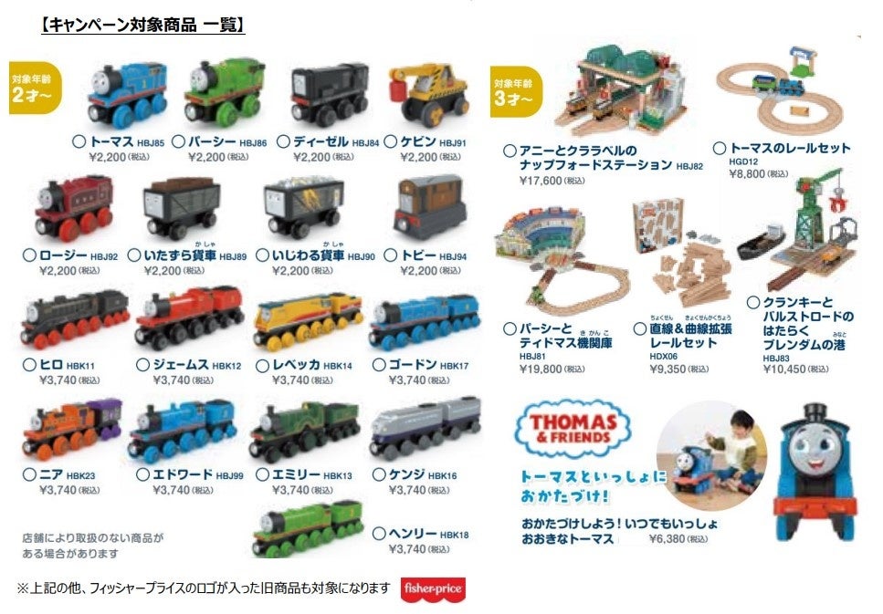 【Point】 ✔ 『大井川鐵道トーマス号乗車ツアー』が当たるキャンペーンを6月17日(土)~8月25日(金)の 期間で実施! ✔ マテルの木製トーマスをはじめとしたマテルのトーマス商品、税込1,500 円以上お買い上げの ✔ また、お子さまに大人気の「きかんしゃトーマス 木製レールシリーズのおはなし」の ✔ トーマスとパーシー、ニアとその仲間たちが、なつやすみに向けてみんなで協力し、 |