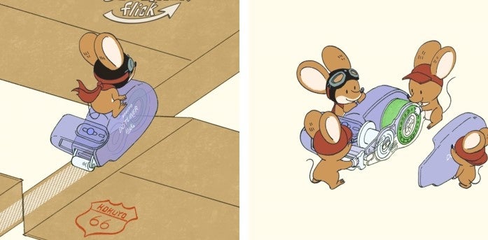 ウサギやネズミ、鳥たちが登場し、キャンパス ソフトリングノート、テープのり<ドットライナーフリック>、2Way携帯ハサミ<ハコアケ>が愛らしく紹介されます。