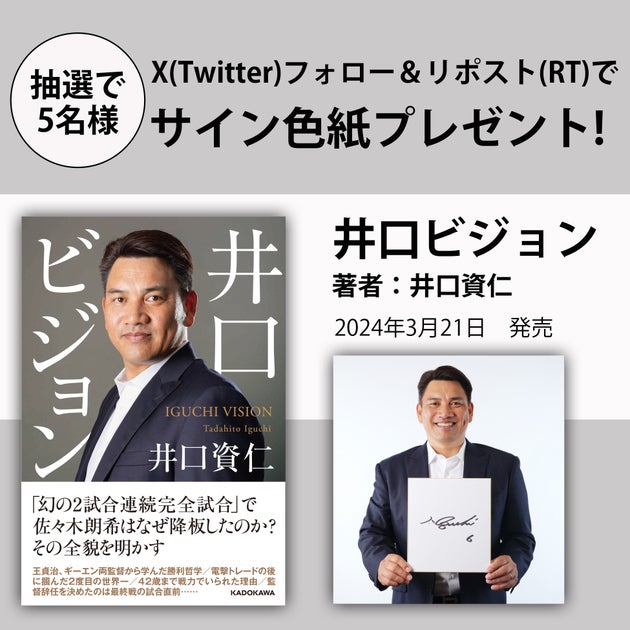 KADOKAWAノンフィクション公式アカウントのTwitterキャンペーン『井口ビジョン』では、井口資仁氏のサイン色紙を抽選で5名様にプレゼントしています。