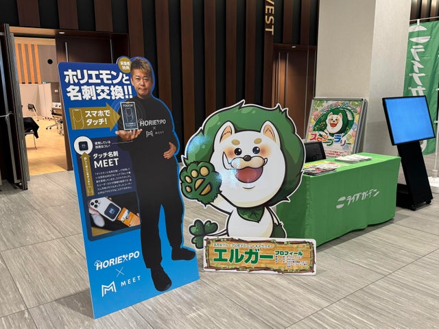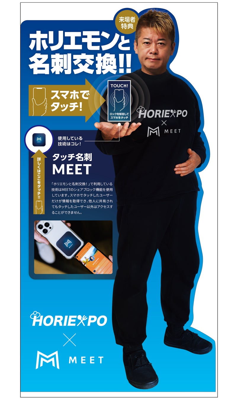 - 堀江貴文氏の等身大パネルには、タッチ名刺「MEET」が搭載