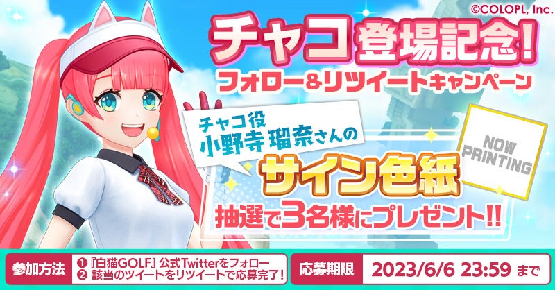 本日5月31日(水)16:00より、プレイヤーのインストラクターを務めている「チャコ(CV:小野寺 瑠奈)」が、プレイアブルキャラクターとして登場しました。新ゴルファー登場を記念した新たなショートPVも公開中ですので、そちらもぜひご覧ください。あわせて公式Twitterでは、「チャコ」のキャラクターボイスを担当する小野寺瑠奈さんの「サイン色紙」が抽選で当たるキャンペーンも開催中です。