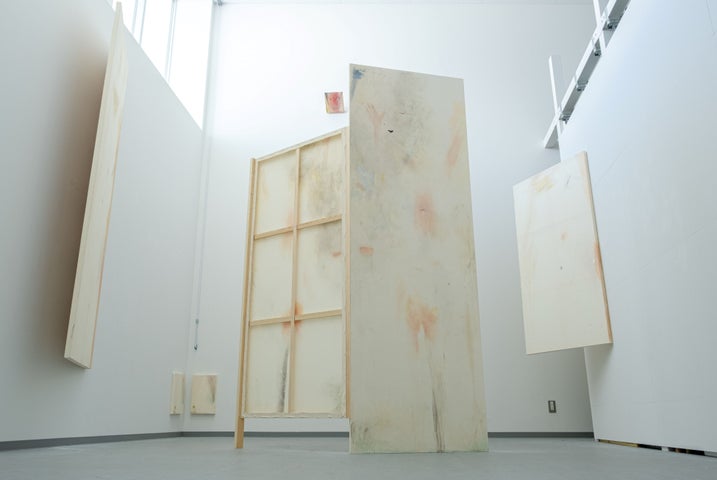 峰松沙矢は、身体のイメージや接触から生まれる感覚とキャンバスの傷から、不安定なイメージの揺らぎを表現しています。