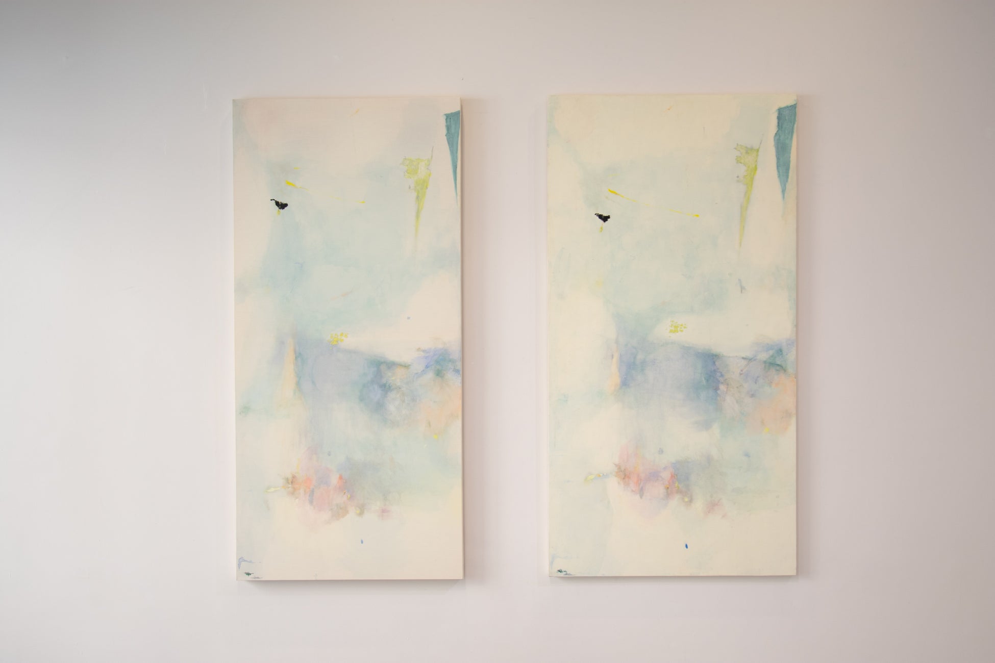 展示空間では、2つの作品が互いのイメージを反映しつつも独立した絵画として展示され、鑑賞者がその間に立つことで相互作用が生まれます。
