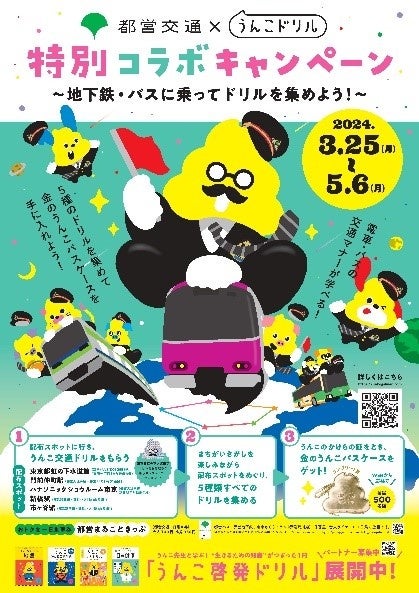 東京都交通局と文響社が共同で開催する「うんこ交通ドリル」イベントでは、ドリルを集めて謎解きに挑戦し、金のうんこパスケースやキラキラステッカーがプレゼントされます。