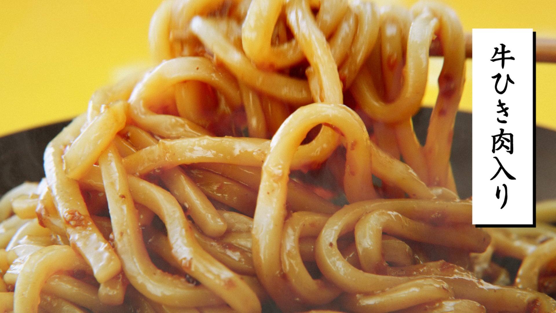 牛肉キャラクターが踊るシーンから始まり、具入り牛すき焼うどんの魅力を表現しています。