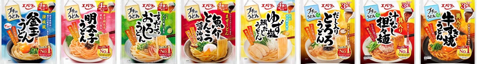 『プチッとうどん』シリーズは個食うどんつゆブランド売上げナンバーワンで、全8品のラインアップで麺メニューのバリエーションを広げています。