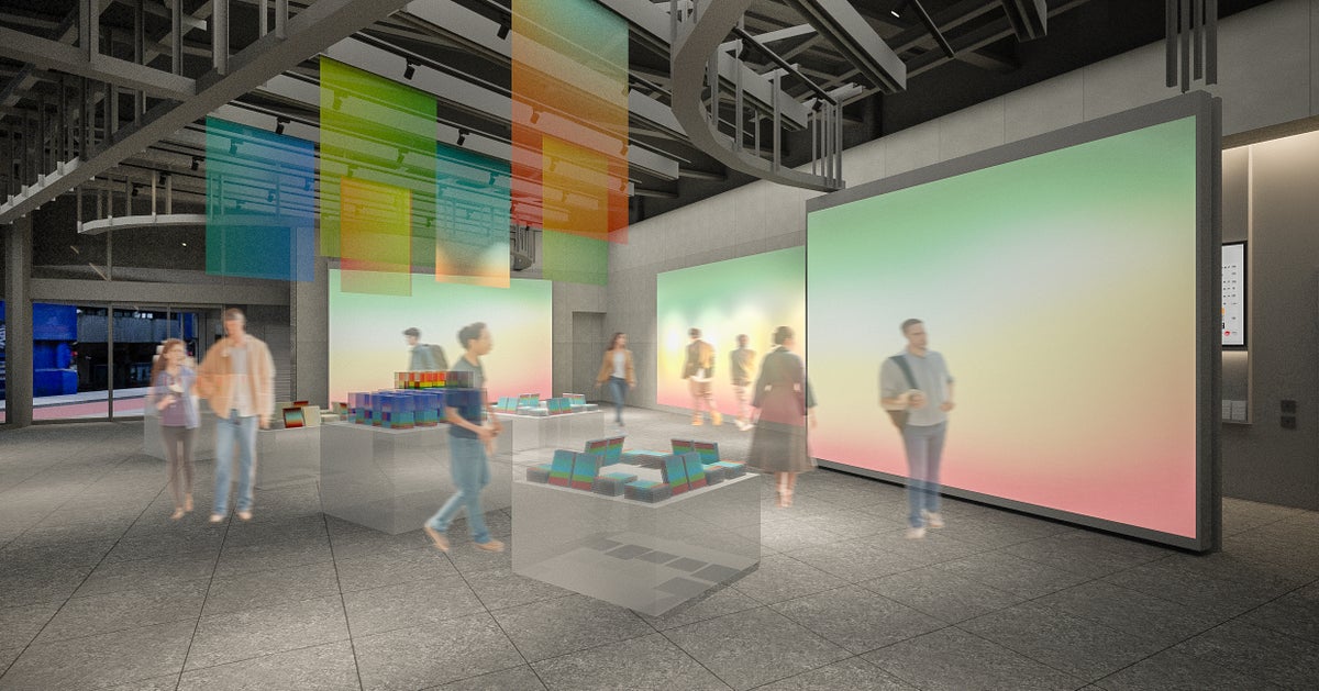 LEDビジョンや美術展示什器を活用した空間で、世界観を体験できる構成となっています。