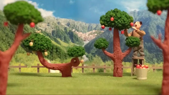 短編コマ撮りアニメ「おかしなりんごの木」は、自由奔放なりんごの木ニョロンと真面目なりんごの木シャッキーが女の子ニーナのために冒険し成長する物語です。