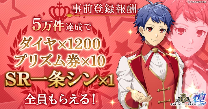 事前登録キャンペーンでは、5万件達成でガチャ10連&SR仲間「一条シン」がプレゼントされます。