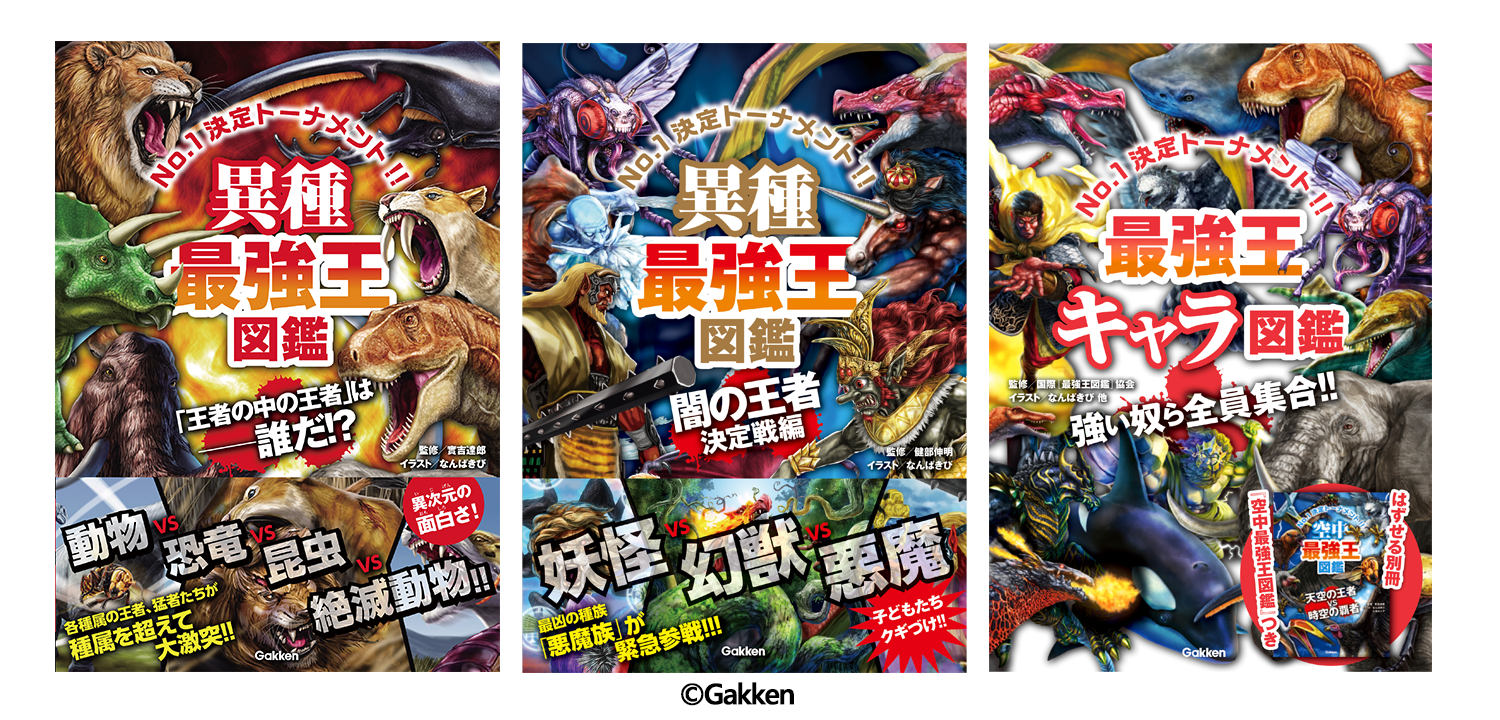 「動物界や恐竜界など、各種属の猛者たちをトーナメント方式で戦わせ、最強を決めてしまおう」というコンセプトで作られたシミュレーションバトル図鑑。2015年の第1弾発売以来、小学生を中心に人気の児童書で、累計発行部数は350万部を突破している。(2023年5月時点)