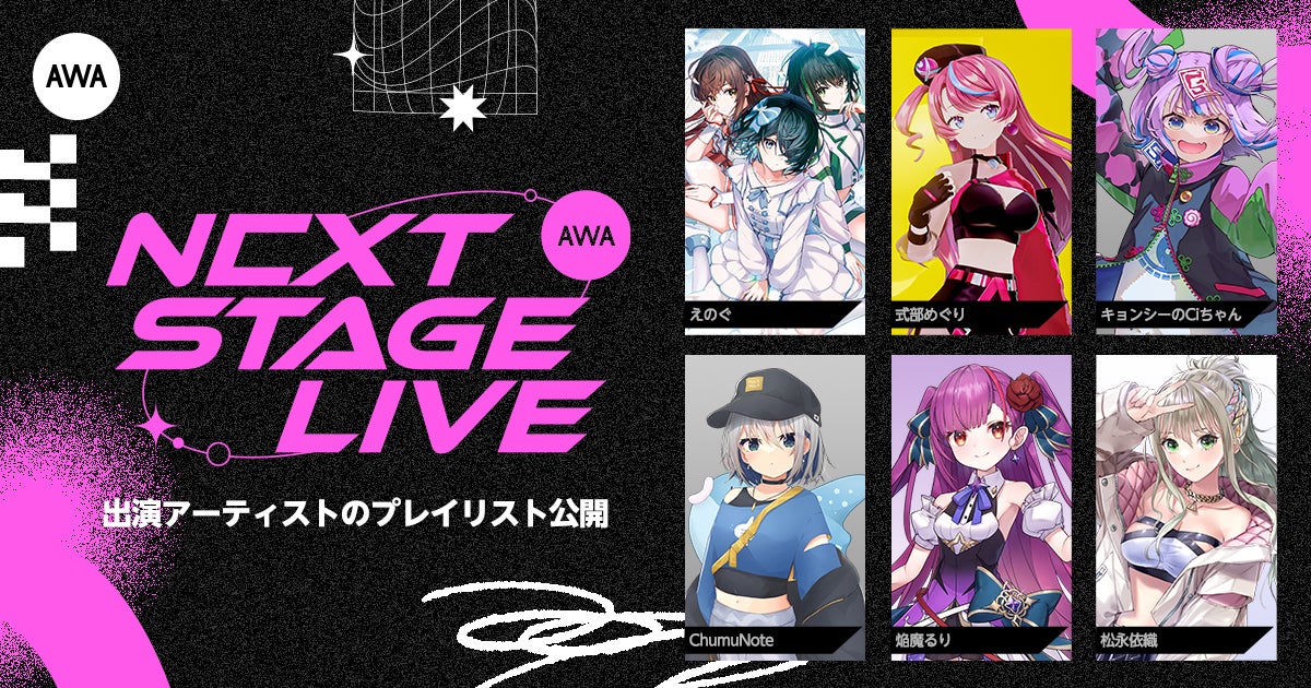 AWA初のVアーティストによるライブ『AWA NEXT STAGE LIVE』には、えのぐ、式部めぐり、キョンシーのCiちゃん、ChumuNote、松永依織、焔魔るりの6名が出演します。
