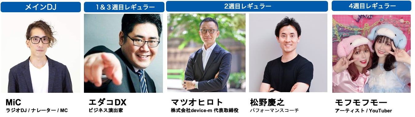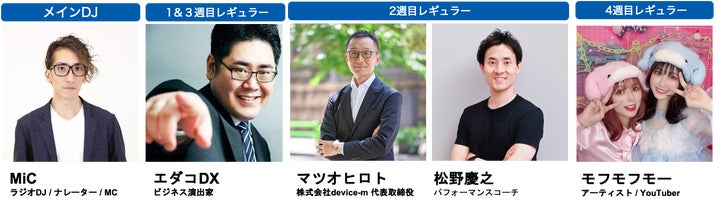出演者には、MiC、ビジネス演出家のエダコDX、株式会社device-m代表のマツオヒロト、パフォーマンスコーチの松野慶之、そしてアーティストのモフモフモーが参加しています。