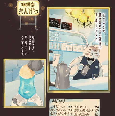 シリーズ第3弾で、三毛猫マスターたちが世界各地の満月珈琲店メニューを紹介しています。