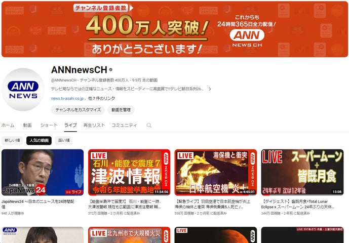 - テレビ朝日のYouTube公式アカウント「ANNニュースチャンネル」が登録者数400万人に到達