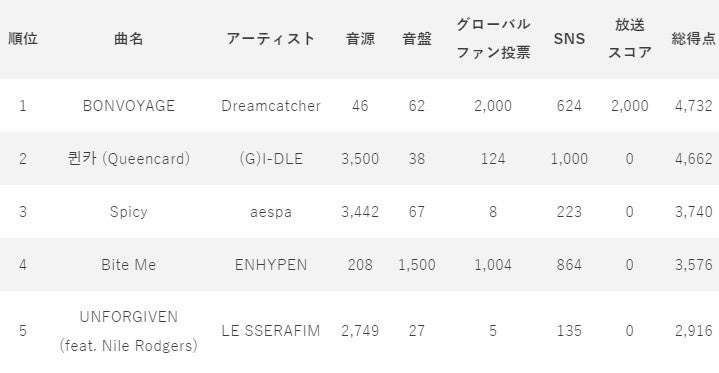 (※)各スコアの割合音源35%、音盤15%、グローバルファン投票(アプリ)20%、SNS10%、放送スコア20%