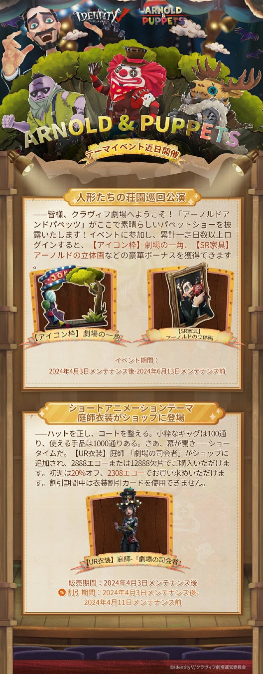 - 『Identity V 第五人格』の新ショートアニメ『ARNOLD & PUPPETS』が2024年4月2日より放送開始予定
