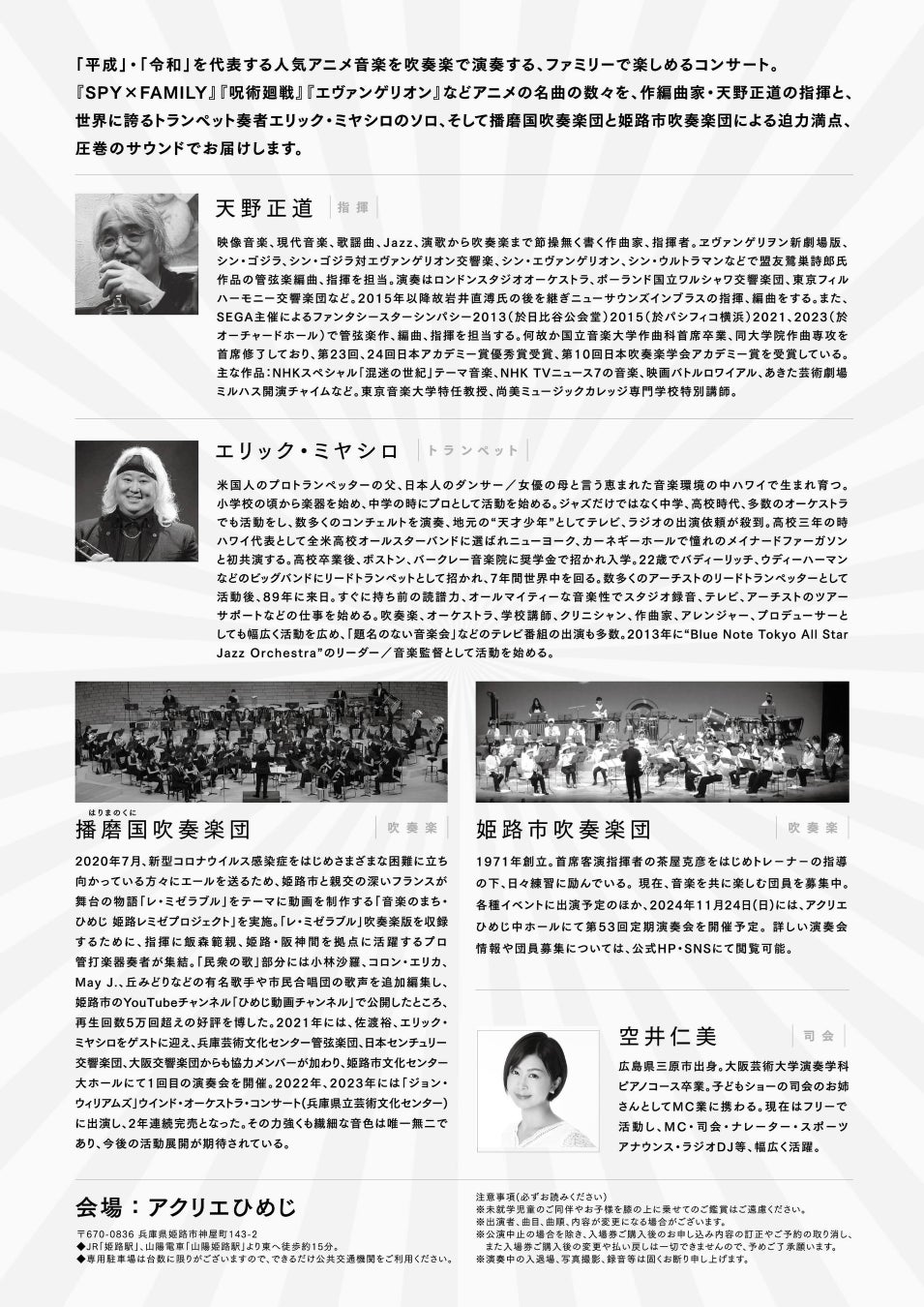 演奏曲目には「呪術廻戦」や「SPY×FAMILY」のテーマ曲、そして「ヱヴァンゲリヲン新吹奏楽版」などが含まれます。