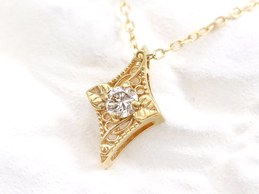 ネックレスには0.1ctのダイヤモンドが輝き、チェーンは最長45cmまで調節可能です。