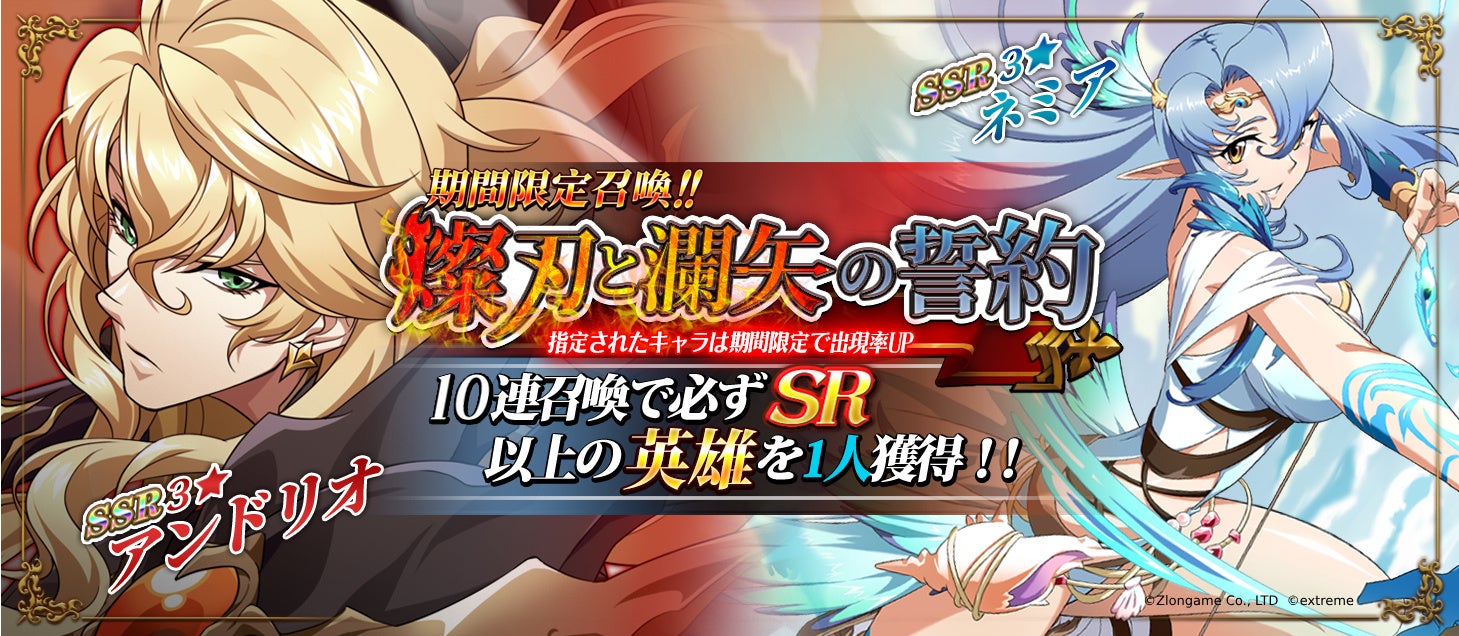 さらに、10連召喚でSR以上の英雄を獲得できる期間限定召喚も実施され、SSRアンドリオとSSRネミアの出現確率がアップします。