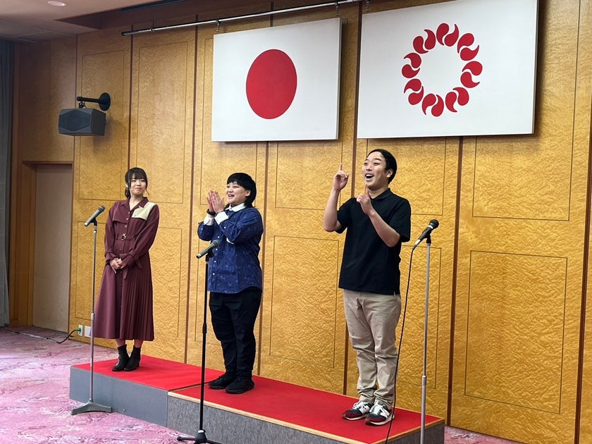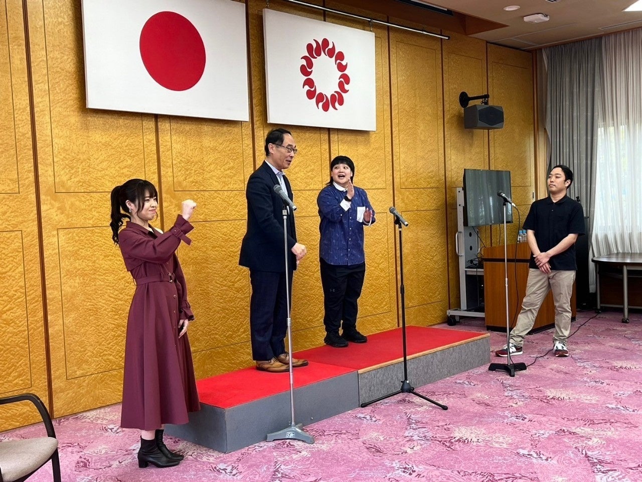 カエルサークル・ソイくんと上河内貴人は手話のレクチャーやゲームを披露し、大野埼玉県知事も手話での自己紹介に挑戦しました。