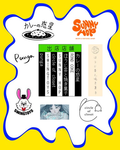 青と黄色のフードやドリンク、古着などが楽しめます。