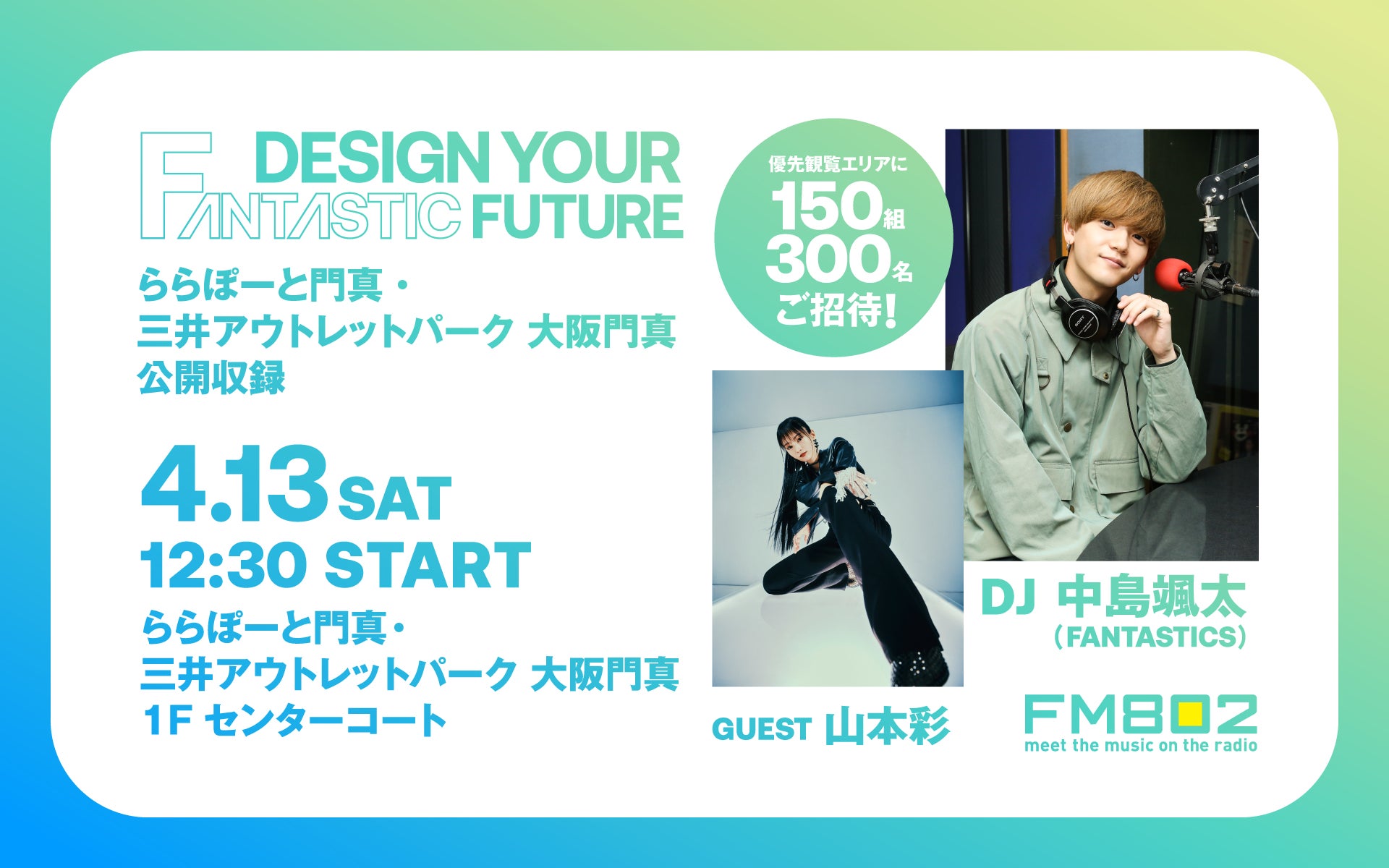 4月13日にららぽーと門真で公開収録が行われ、大阪出身の山本彩がゲスト出演します。