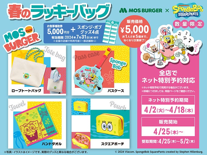 モスバーガーが『スポンジ・ボブ』とコラボしたおもちゃや春のラッキーバッグを提供します。