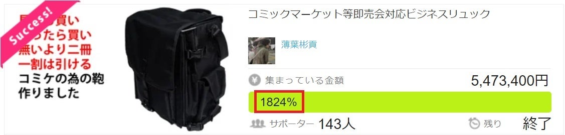 「八咫鴉」というカバンは、同人誌即売会向けの鞄として支援を募り、1800%の支援を達成しました。