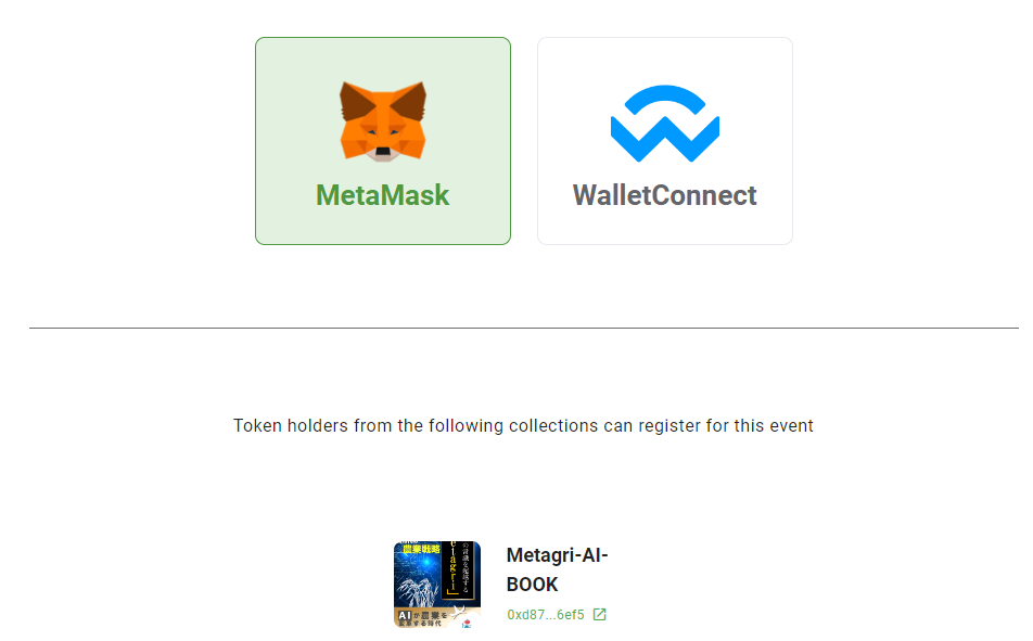 参加者はMetaMask、WalletConnectのいずれかのウォレットサービスを通じてNFTを認証することで、トークンゲーティングチケットを申し込みできるようになります。