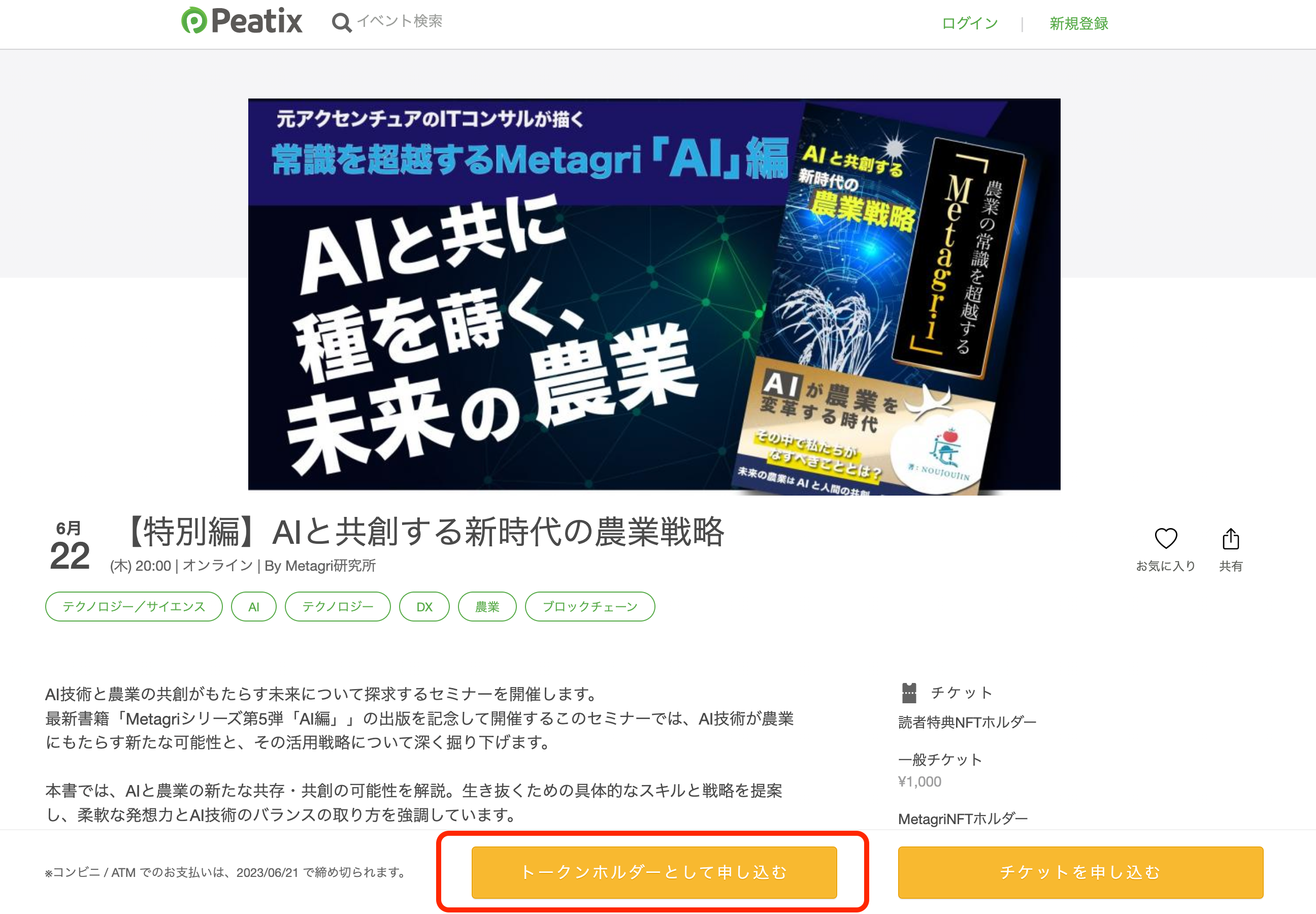 Peatixの新サービス「Peatixトークンゲーティング」を採用し、書籍「AIと共創する新時代の農業戦略」の読者特典NFTホルダーは無料で参加できる。