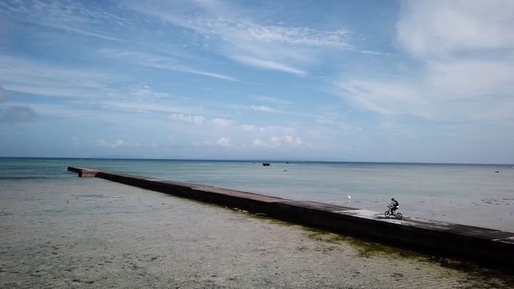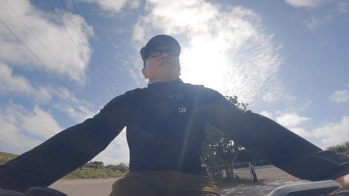 山田は自転車で移動しながらポイントを探し、小型のシロイカを釣り上げます。