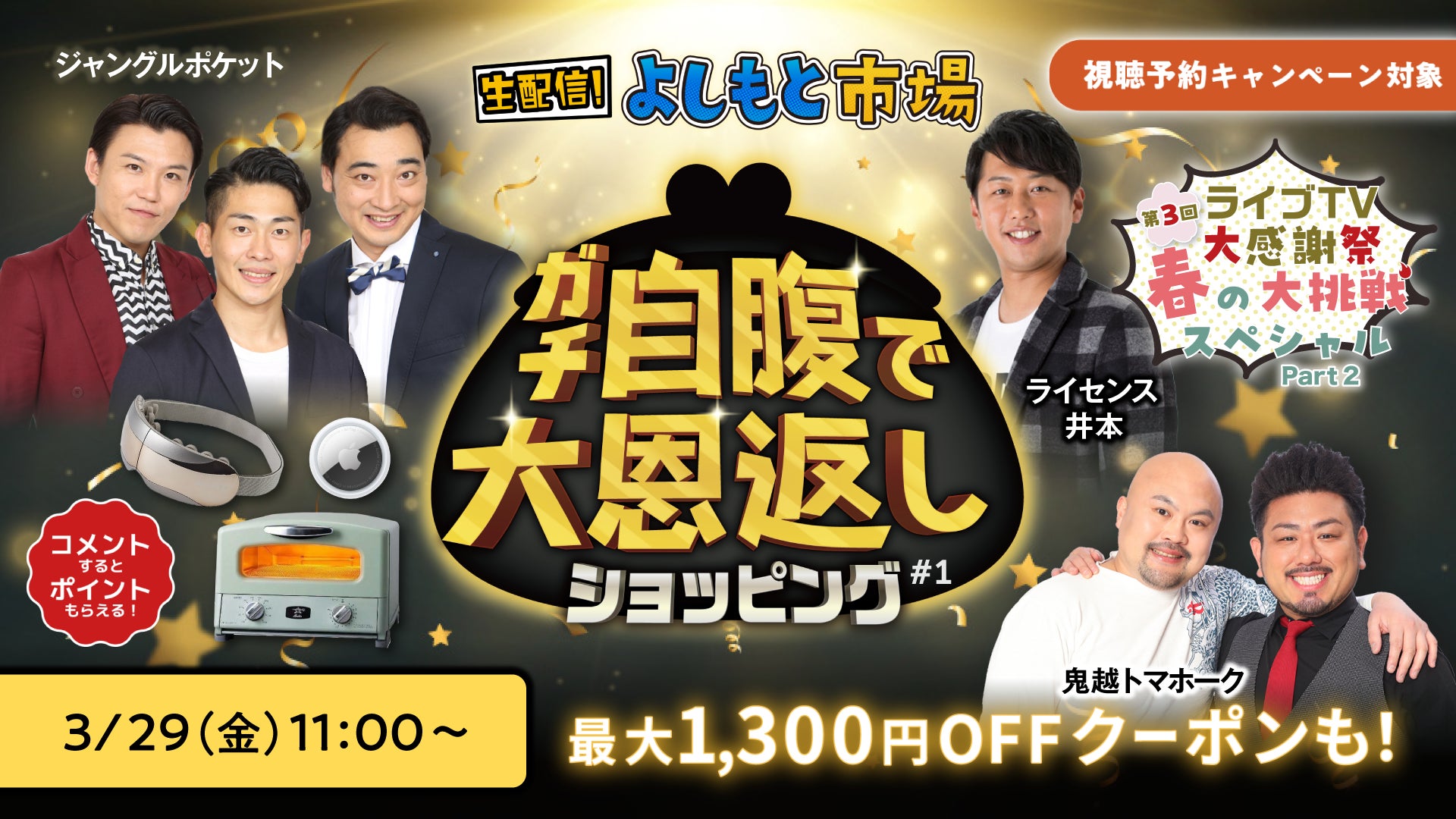 - 生配信!よしもと市場、ガチ自腹で大恩返しショッピング、下剋上お笑いGP