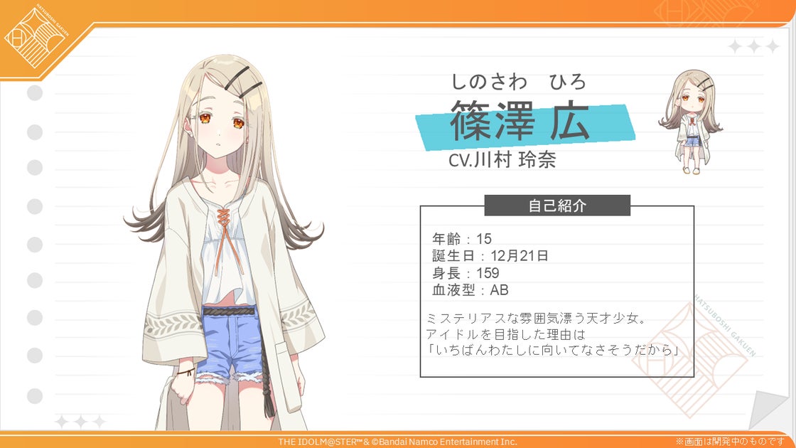 「篠澤 広」(CV:川村 玲奈)は、ミステリアスな雰囲気を持つ天才少女です。