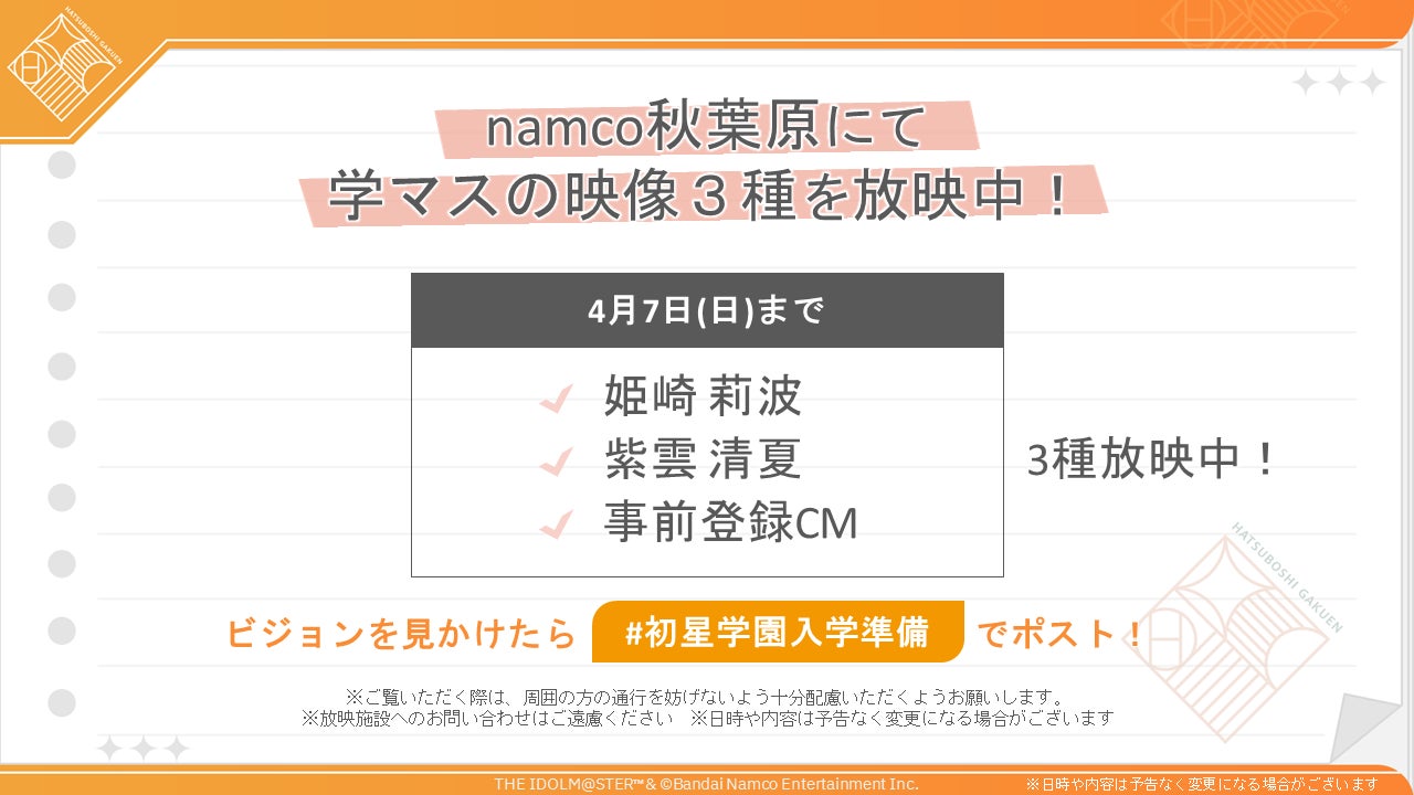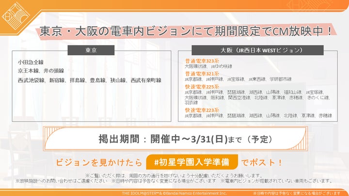 篠澤 広のCMは東京・大阪の電車内ビジョンでも放映されており、ビジョンを見かけたら「#初星学園入学準備」でポストしてください。