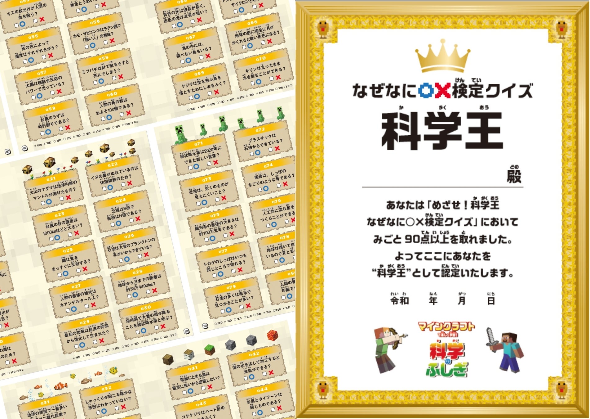 マインクラフトのキャラクターと一緒に身近な事象に関するクイズに挑戦し、科学的な解説や図版で理解を深めます。