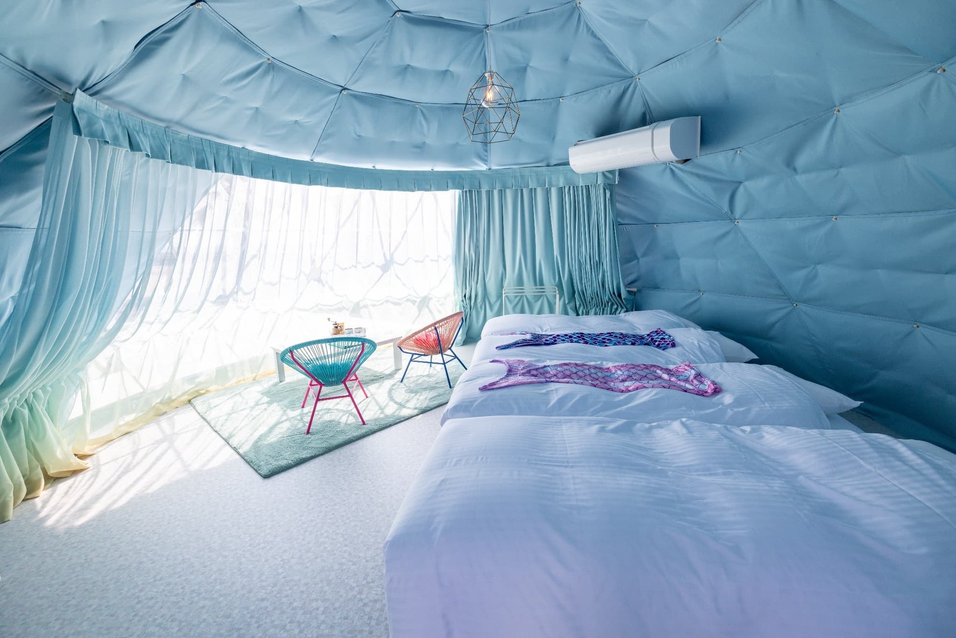 『Sugar Beach Oarai』はHAMIRUが大洗町にオープンする新しいグランピング施設で、全室オーシャンビューのテントやオールインクルーシブの食事など、非日常的な癒しの空間を提供します。