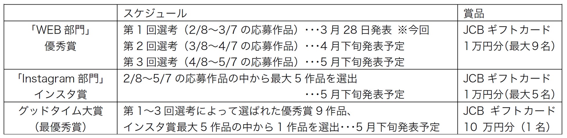 優秀賞9作品と新設のInstagram部門「インスタ賞」最大5作品から、「グッドタイム大賞」1作品が選ばれ、5月下旬に発表されます。