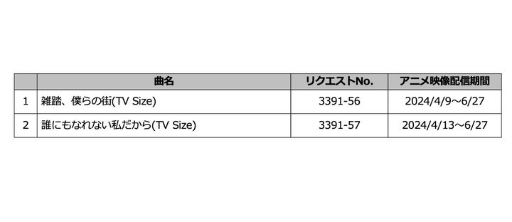 DAMでは、バンド・トゲナシトゲアリが歌うOP主題歌「雑踏、僕らの街」とED主題歌「誰にもなれない私だから」のアニメ映像を配信し、歌唱キャンペーンも行います。