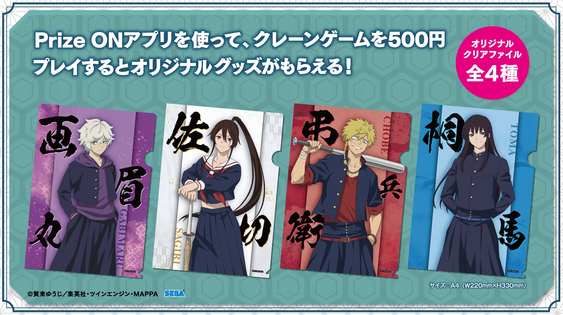 限定グッズは、セガプライズ(クレーンゲーム専用景品)描き下ろしデザインを使用したオリジナルクリアファイル全4種。『地獄楽』の人気キャラクターが制服姿で登場します。
