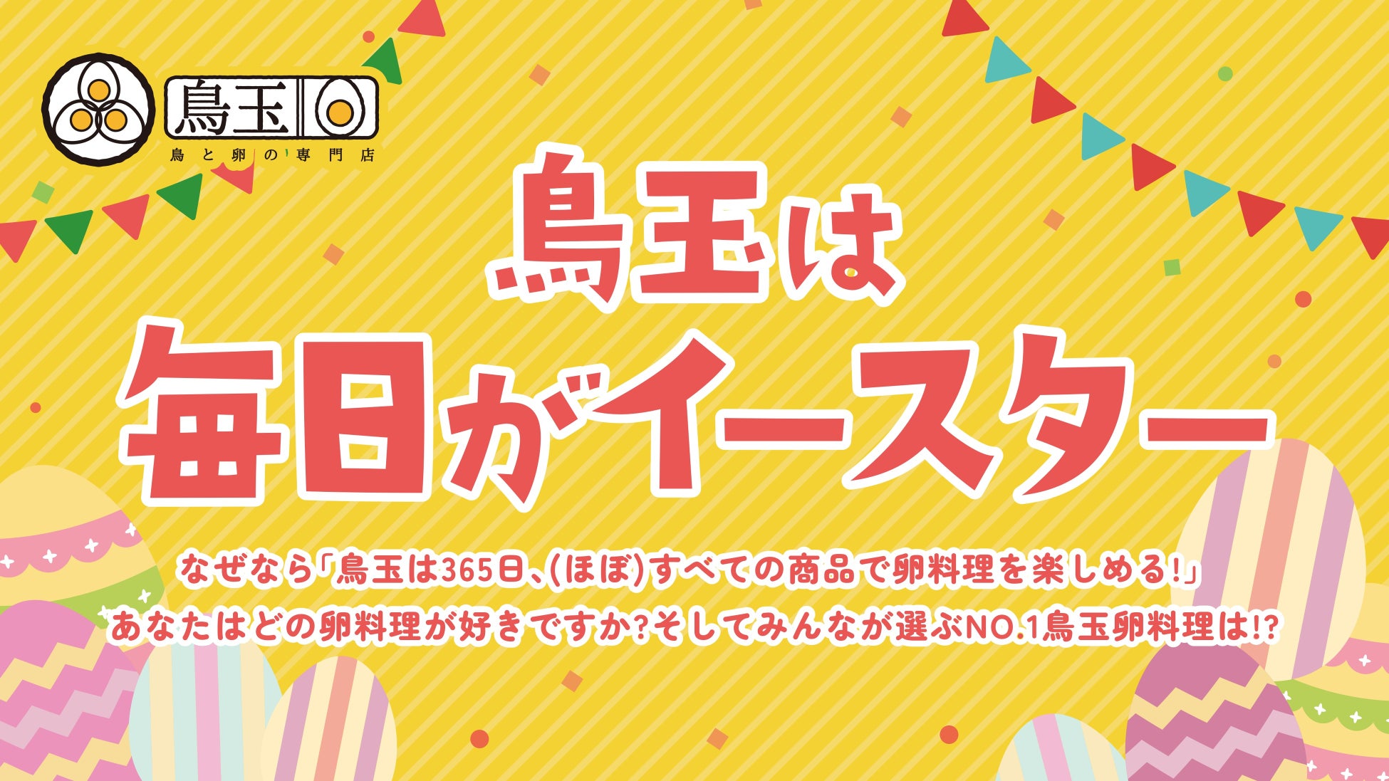 - 鳥玉は毎日がイースター、お子様イースター、投票イースター、ジュースプレゼント、人気No.1卵料理、関東3店舗・東北1店舗・沖縄6店舗