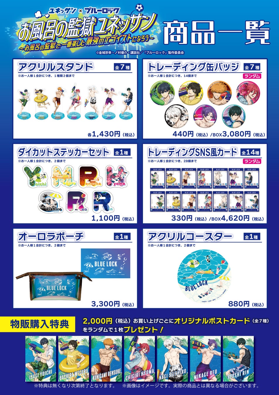 コラボグッズは前半戦では水着姿のアクリルスタンドや缶バッジなどが登場します。