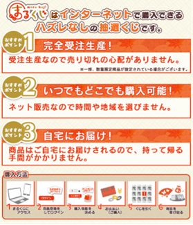 『まるくじ』はインターネットで購入できるハズレなしの抽選くじサービスです。各アイテムがすべて受注生産なので売り切れの心配はありません。(※)